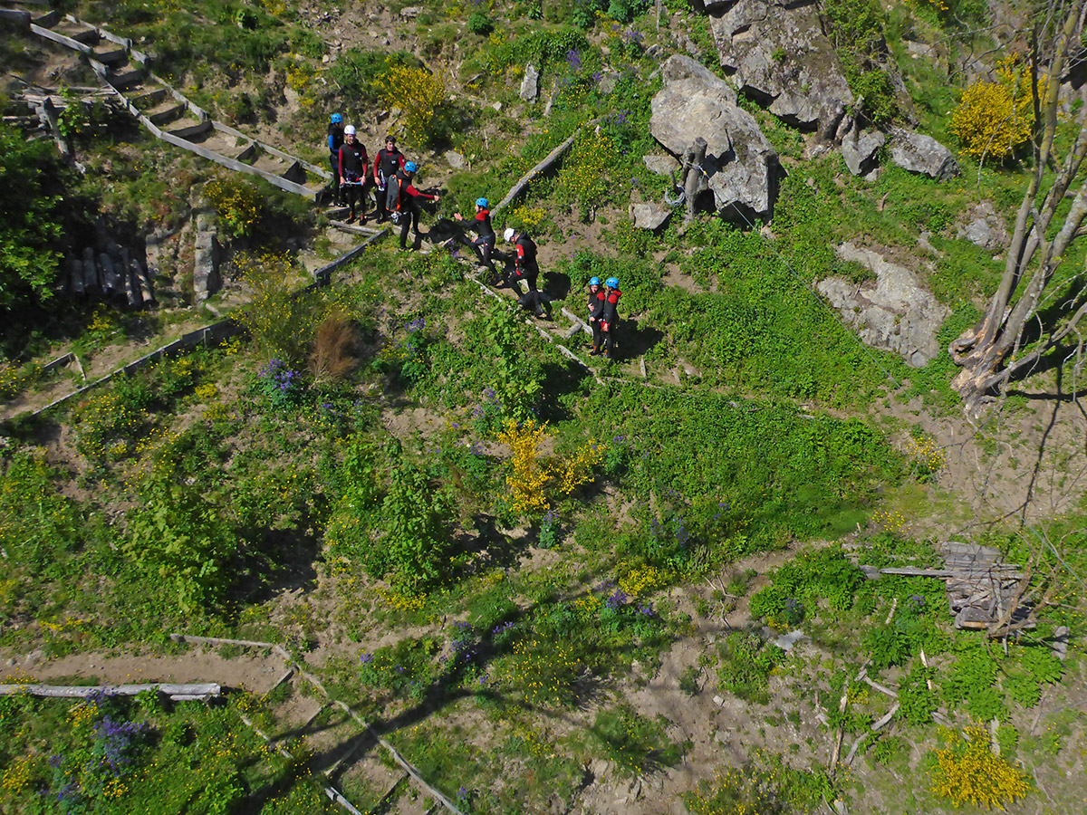 De nombreux sauts possibles et jusqu’à 5 mètres dans cette dernière vasque. En 3 minutes nous accédons au départ de la tyrolienne de retour (évitable) : 90 mètres de long à 40 mètres au-dessus du canyon.